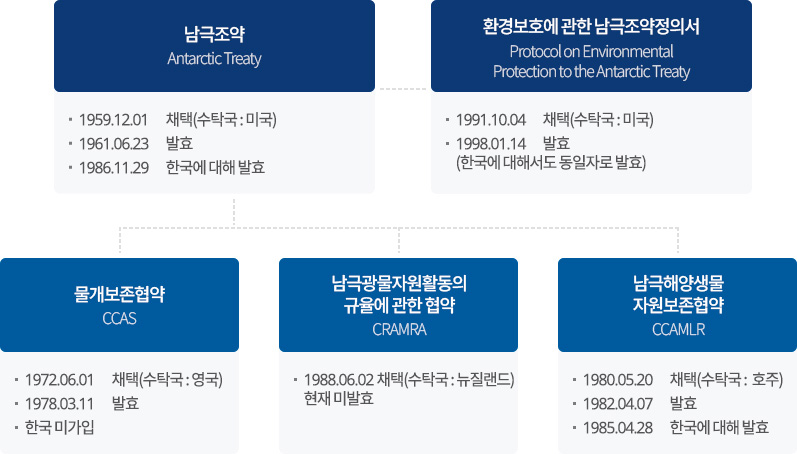 남극의 해양, 광물, 그리고 환경에 관련된 조약들은 “남극조약협의당사국(Antarctic Treaty Consultative Party)”에 의하여 논의되었으며, 이들 조약들은 남극조약의 제 원칙을 확인한다는 규정을 삽입하여 남극조약에 따라 다른 조약들이 성립되었음을 나타내고 있습니다. 현재 남극조약은 전 세계 58개 국가(협의당사국 29개국, 비협의당사국 29개국)가 당사국으로 가입되어 있습니다.